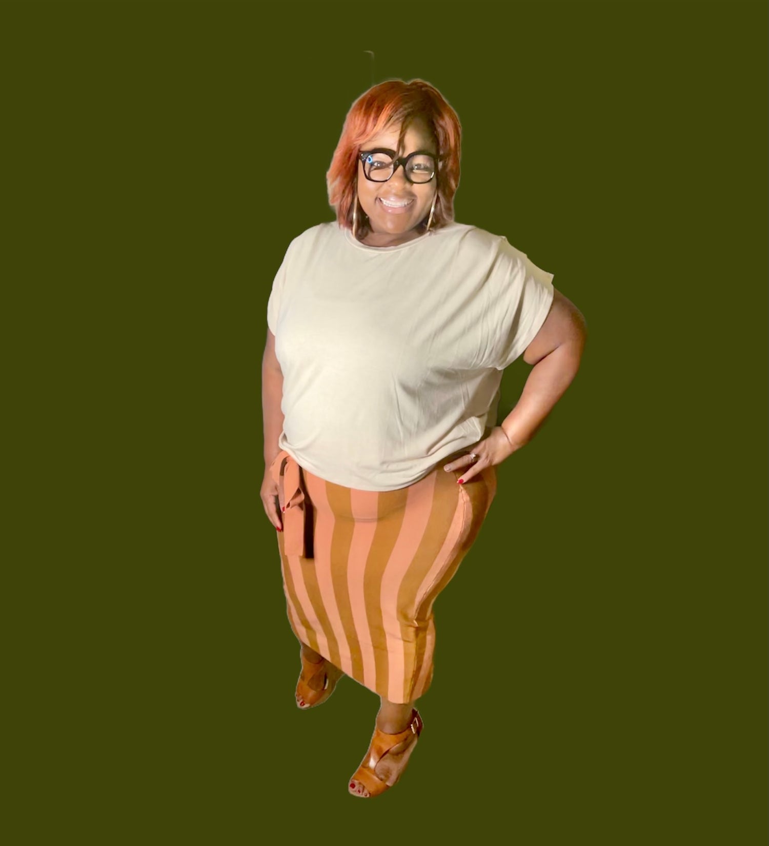 One of those year-round skirts. This gorgeous midi-skirt has alternating stripes of salmon pink and camel. The tie belt detailing at the waist and subtle slit up the back are the final touches to this show stopper. Runs Smaller.